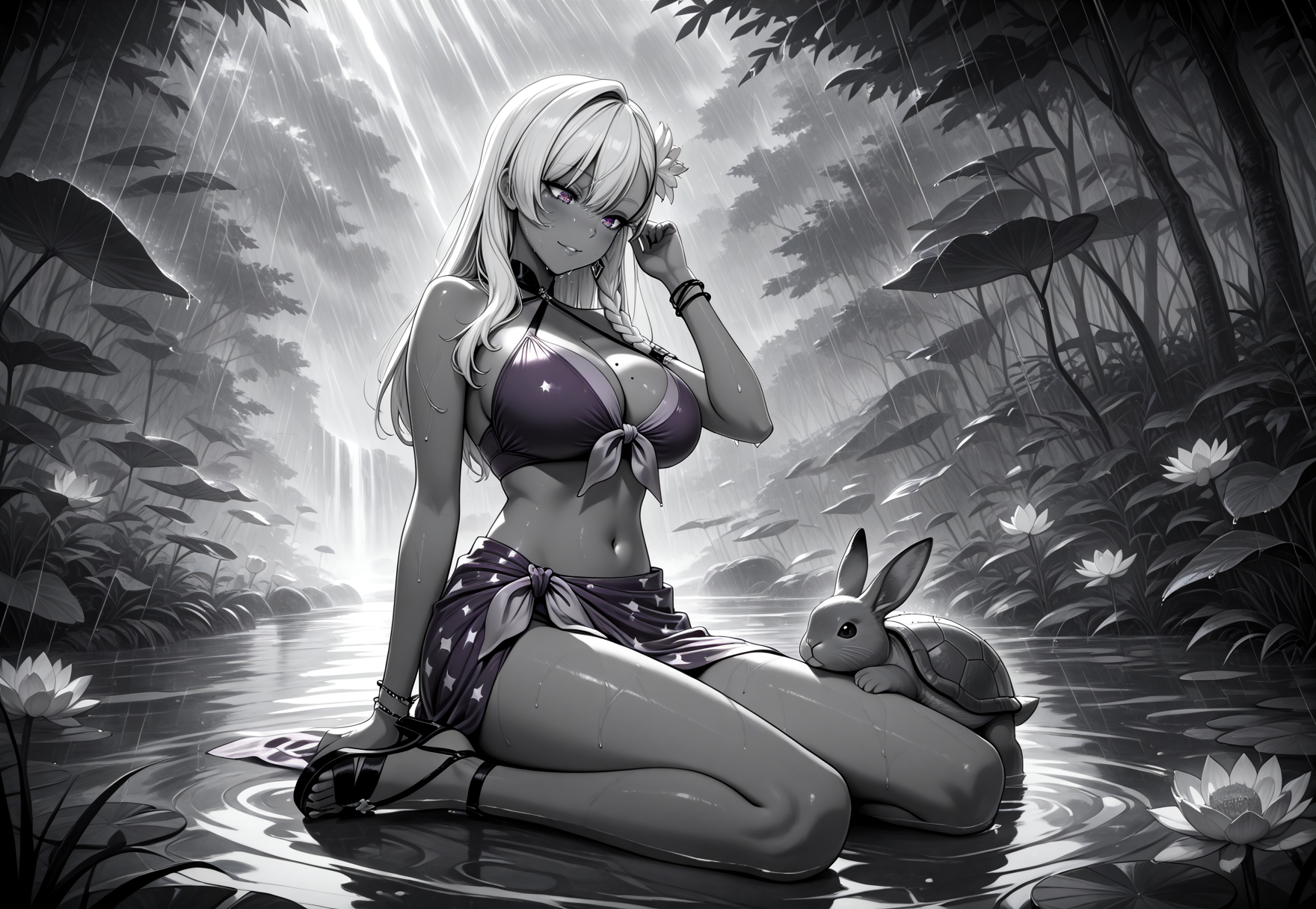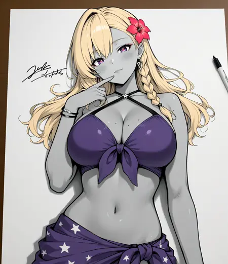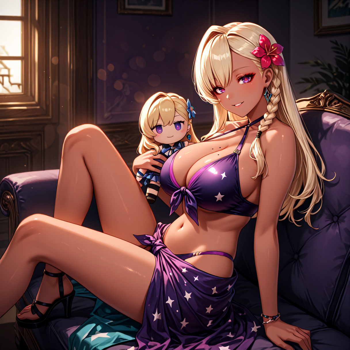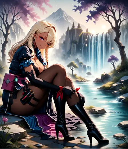 | 训练词汇 | ninstand,dark-skinned female,asymmetrical bangs, asymmetrical hair, blonde hair, single braid, side braid, long hair,purple eyes, red pupils,mole on breast,large breasts, single earring,cleavage,jewelry, black elbow gloves,black bra,frilled sleeves, short sleeves, wrist ribbon, red ribbon, side slit dress, frilled dress, long dress, waist belt, pink belt, pink bag, holstered book, minishorts, black shorts, brown pantyhose, thigh strap, thigh holster, test tube holster,knee boots, high heel boots, black high heels, black footwear,已复制! ninswim,dark-skinned female, asymmetrical bangs, asymmetrical hair, blonde hair, single braid, side braid, long hair, purple eyes, red pupils, mole on breast,cleavage, large breasts,single earring,hair ornament, hair flower,criss-cross halter, midriff, purple bikini, bracelet, star print sarong, halterneck, navel, high heel sandals,已复制! |
