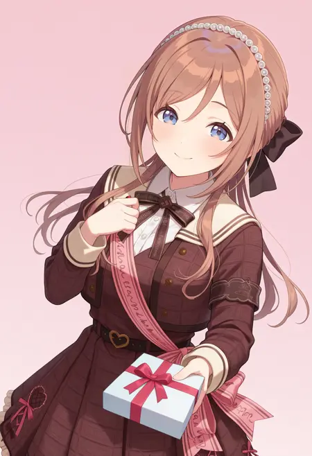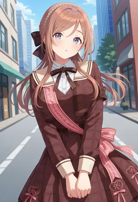 outfit3aarinami, long hair, brown hair, hair bow, hair beads, blue eyes, neck ribbon, black ribbon, collared shirt, white sailor collar, plaid, cropped jacket, brown jacket, brown dress, shoulder sash, pink ribbon, long sleeves, black belt