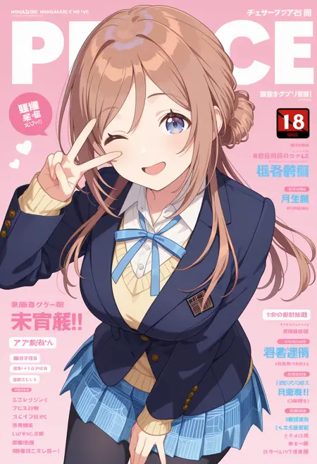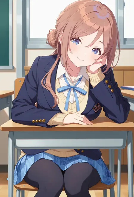 outfit1aarinami, long hair, brown hair, single hair bun, blue eyes, school uniform, neck ribbon, collared shirt, white shirt, yellow sweater, blazer, blue jacket, long sleeves, pleated skirt, blue skirt, black pantyhose
