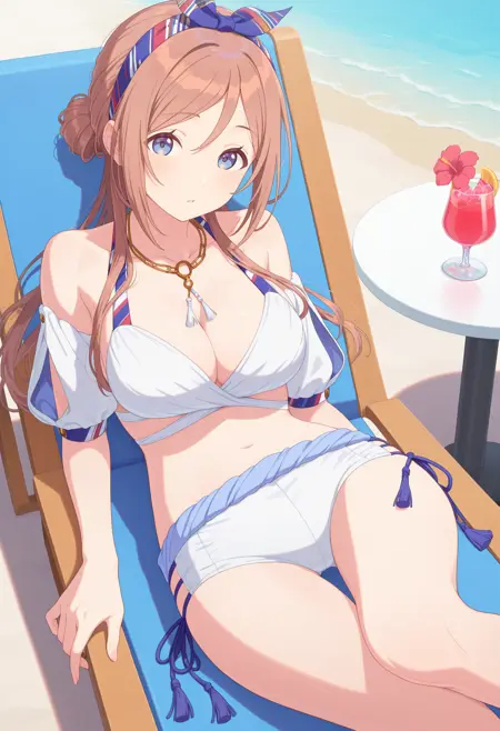 outfit2aarinami, long hair, brown hair, single hair bun, hairband, hair ribbon, blue eyes, necklace, cleavage, swimsuit, white bikini, detached sleeves, short shorts, white shorts, thigh gap