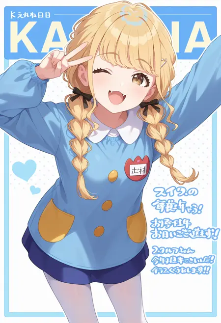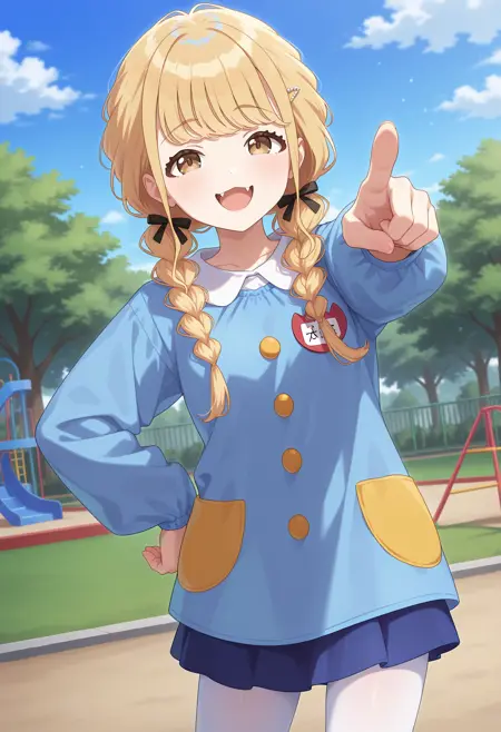 outfit5aakotone, long hair, blonde hair, low twintails, twin braids, hair ribbon, hair ornament, brown eyes, fangs, kindergarten uniform, blue shirt, long sleeves, name tag, buttons, blue skirt, white pantyhose