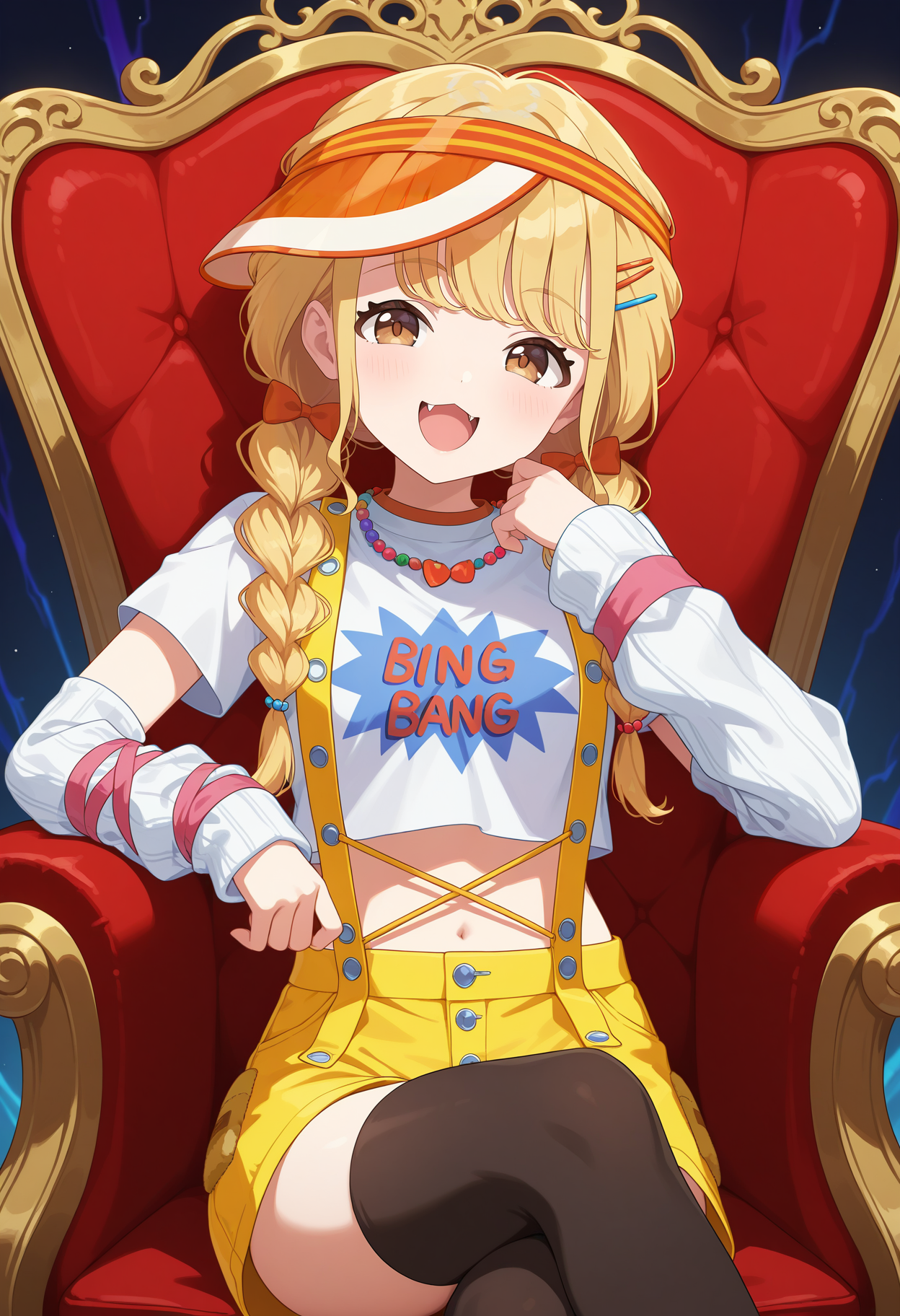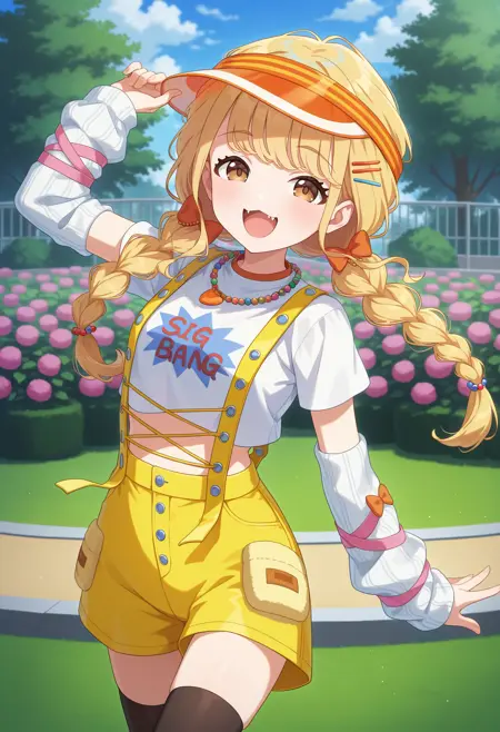outfit6aakotone, long hair, blonde hair, low twintails, twin braids, hair bow, visor cap, hairclip, brown eyes, fangs, bead necklace, overalls, suspenders, print shirt, white shirt, short sleeves, detached sleeves, midriff, yellow shorts, black thighhighs