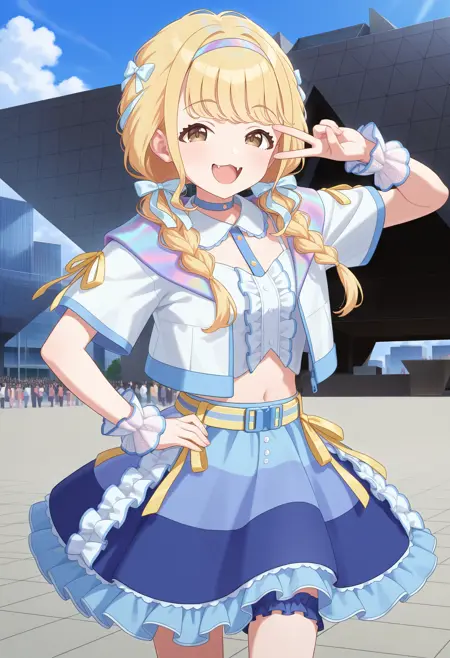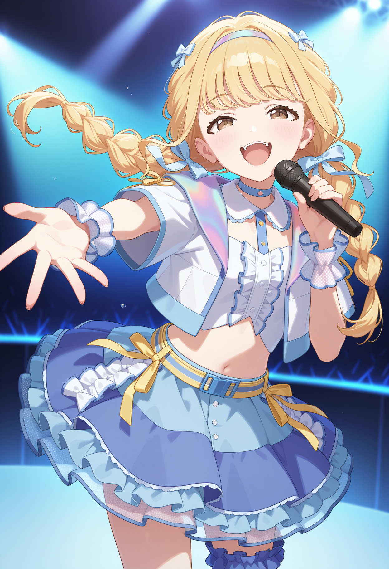 outfit3aakotone, long hair, blonde hair, low twintails, twin braids, hair bow, hairband, brown eyes, fangs, idol clothes, blue choker, white shirt, center frills, cropped jacket, white jacket, wrist cuffs, midriff, yellow belt, frilled skirt, blue skirt, bridal garter