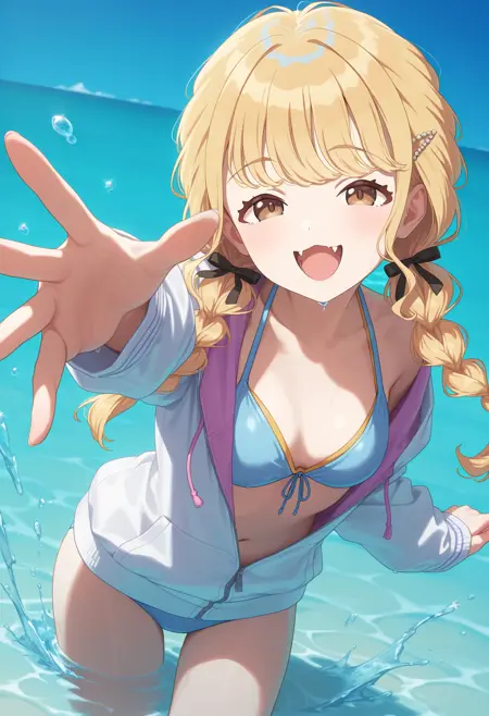 outfit2aakotone, long hair, blonde hair, low twintails, twin braids, hair ribbon, hair ornament, brown eyes, fangs, blue bikini, white jacket, long sleeves, partially unzipped