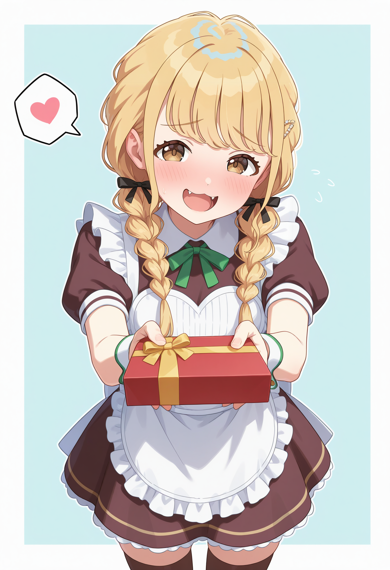 outfit8aakotone, long hair, blonde hair, low twintails, twin braids, hair ribbon, hair ornament, brown eyes, fangs, neck ribbon, brown dress, puffy sleeves, short sleeves, wrist cuffs, frilled apron, white apron, brown thighhighs