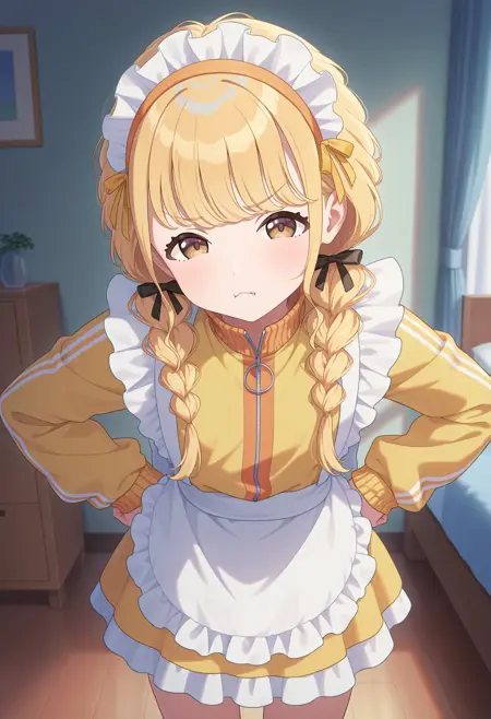 outfit7aakotone, long hair, blonde hair, low twintails, twin braids, hair ribbon, maid headdress, brown eyes, fangs, track jacket, yellow jacket, yellow dress, long sleeves, white apron, bandaid on leg