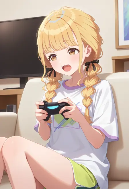 outfit4aakotone, long hair, blonde hair, low twintails, twin braids, hair ribbon, brown eyes, fangs, t-shirt, white shirt, short sleeves, green shorts