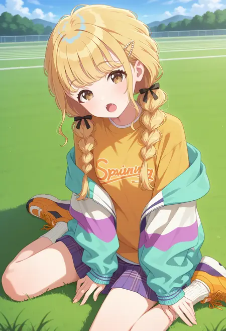 outfit1aakotone, long hair, blonde hair, low twintails, twin braids, hair ribbon, hair ornament, brown eyes, fangs, orange shirt, clothes writing, multicolored jacket, open jacket, long sleeves, plaid skirt, purple skirt