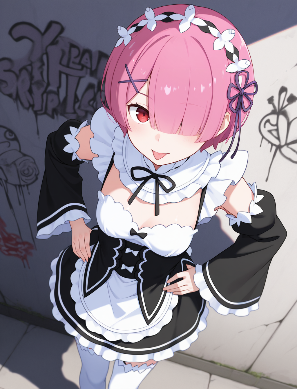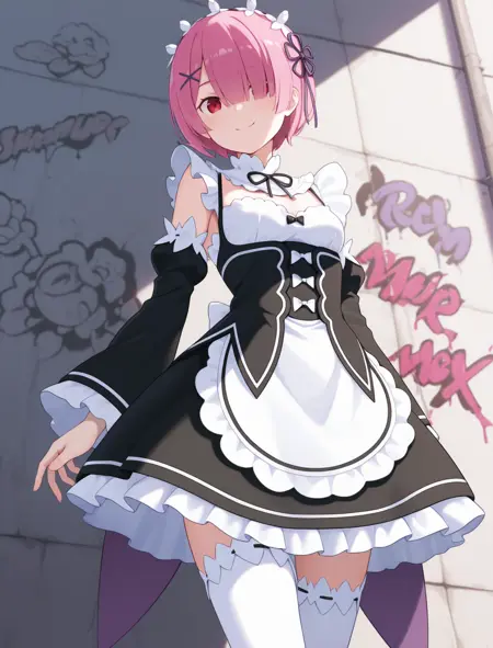 복장: 머리 리본, x 머리 장식, 앞치마, 검은 리본, 검은 치마, 검은 소매, 분리형 칼라, 분리형 소매, 꽃, 주름진 앞치마, 주름진 치마, 주름, 머리 화환, 긴 소매, 메이드, 미니 스커트, 목 리본, 보라색 리본, 리본, 리본 장식, 리본 장식 소매, 로스왈 저택 메이드 유니폼, 치마, 허벅지 긴 양말, 허리 앞치마, 흰색 앞치마, 흰색 허벅지 긴 양말