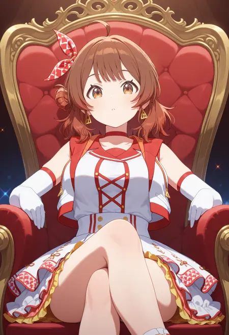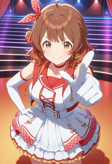 outfit3aaume, medium hair, brown hair, ahoge, hair ribbon, earrings, brown eyes, red choker, idol clothes, layered dress, white dress, cropped jacket, white jacket, sleeveless, elbow gloves, white gloves