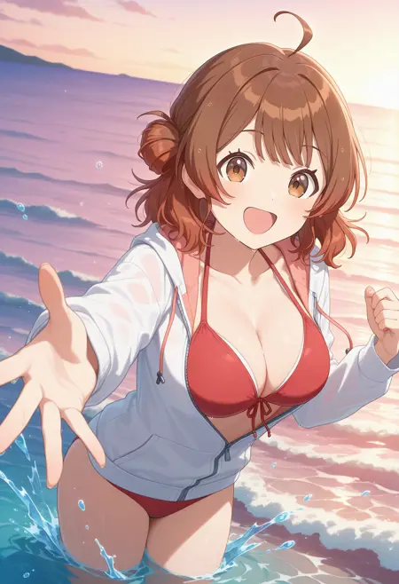 outfit4aaume, medium hair, brown hair, ahoge, single hair bun, brown eyes, collarbone, cleavage, red bikini, white jacket, long sleeves, partially unzipped