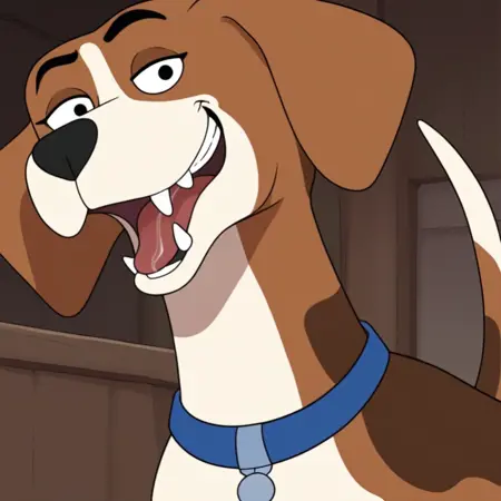 dog, beagle, brown and white fur, black eyes, dog ears, dog tail, black nose, blue collar,