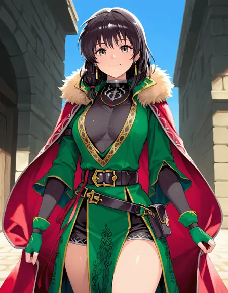 Add "earrings,necklace,red cape,green gloves,fingerless gloves,layered dress,black belt,black pouch,pelvic curtain,black kneehighs,armored boots" for her attuned look.