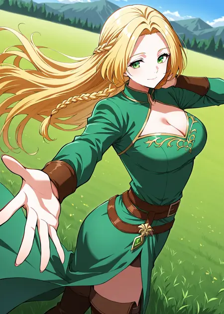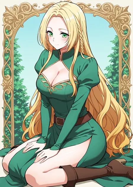 green dress, long sleeves, ornate gold patterns, wide brown belt, cleavage, high-heeled boots, anime style