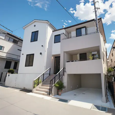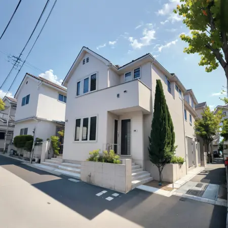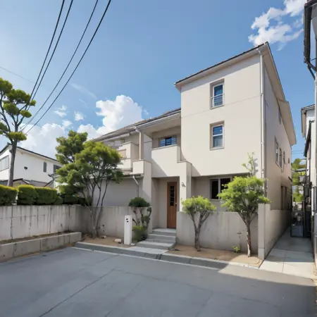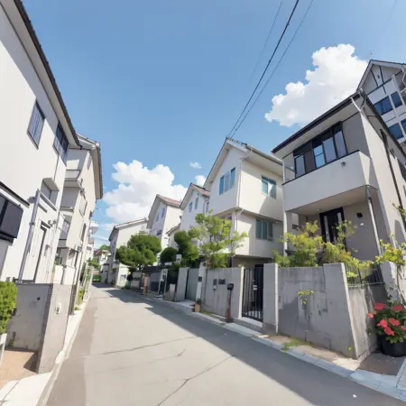 jyutaku, japan, scenery, outdoors, sky, power lines, building, road, window, street, utility pole, blue sky, day, house, fence, city, lamppost, cityscape, realistic,