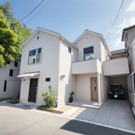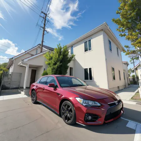 jyutaku, japan, scenery, car, ground vehicle, motor vehicle, outdoors, tree, scenery, sky, building, window, vehicle focus, day, real world location, power lines, blue sky, utility pole, lamppost, road, house, realistic, toyota