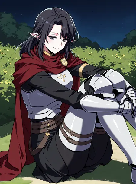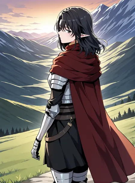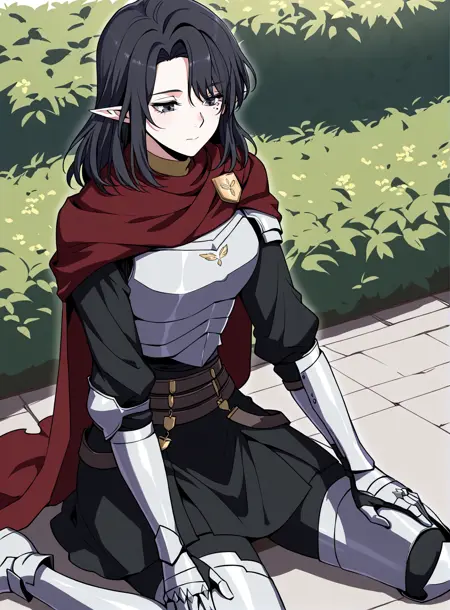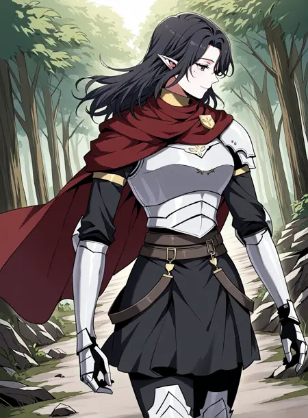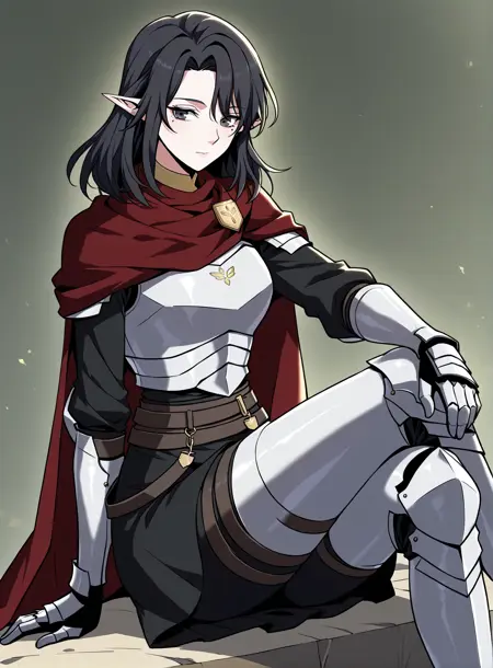 dark red cape, red scarf, golden crest, white chest armor, silver gauntlets, armored gloves, black undershirt, dark skirt armor, waist belts, thigh armor, armored boots, cloak fluttering, fantasy knight outfit, fantasy style