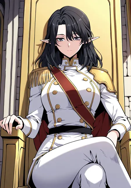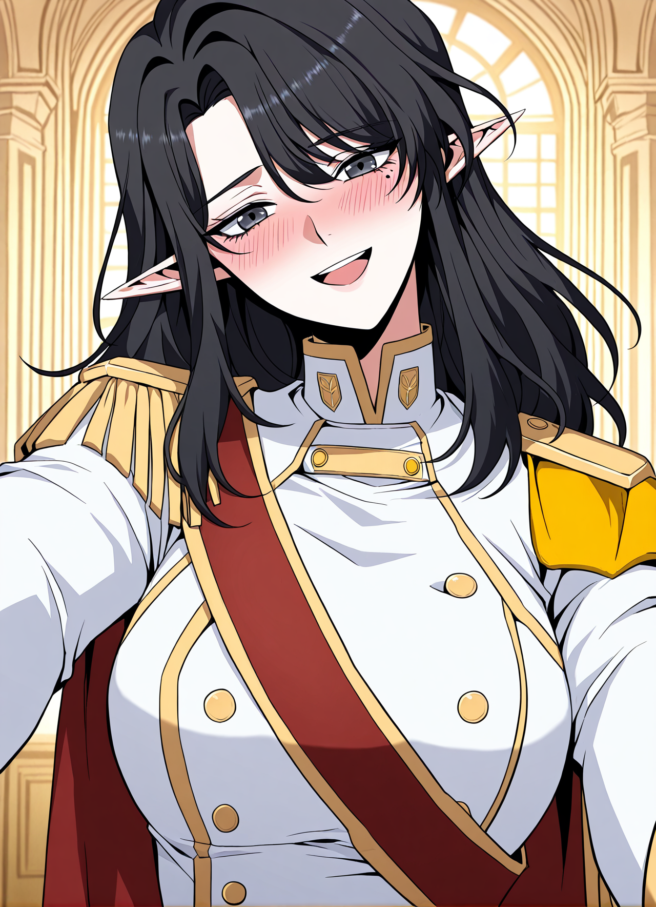 white military uniform with gold trim, gold shoulder pads, red sash, high collar, double-breasted buttons, golden epaulettes, detailed uniform folds