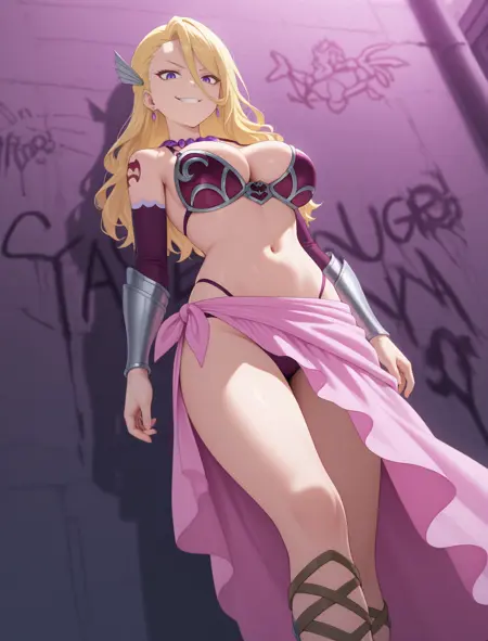 복장: 머리장식, 귀걸이, 보석, 목걸이, 문신, 비키니 갑옷, 가슴 노출, 분리형 소매, 수영복, 배꼽, 연한 분홍색 사롱, 긴 사롱, 글라디에이터 샌들