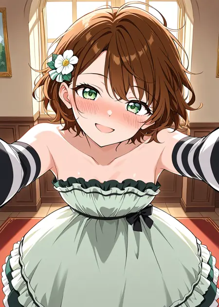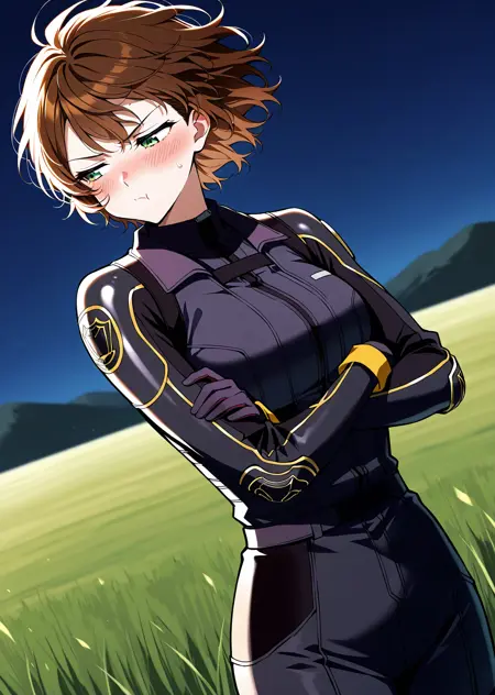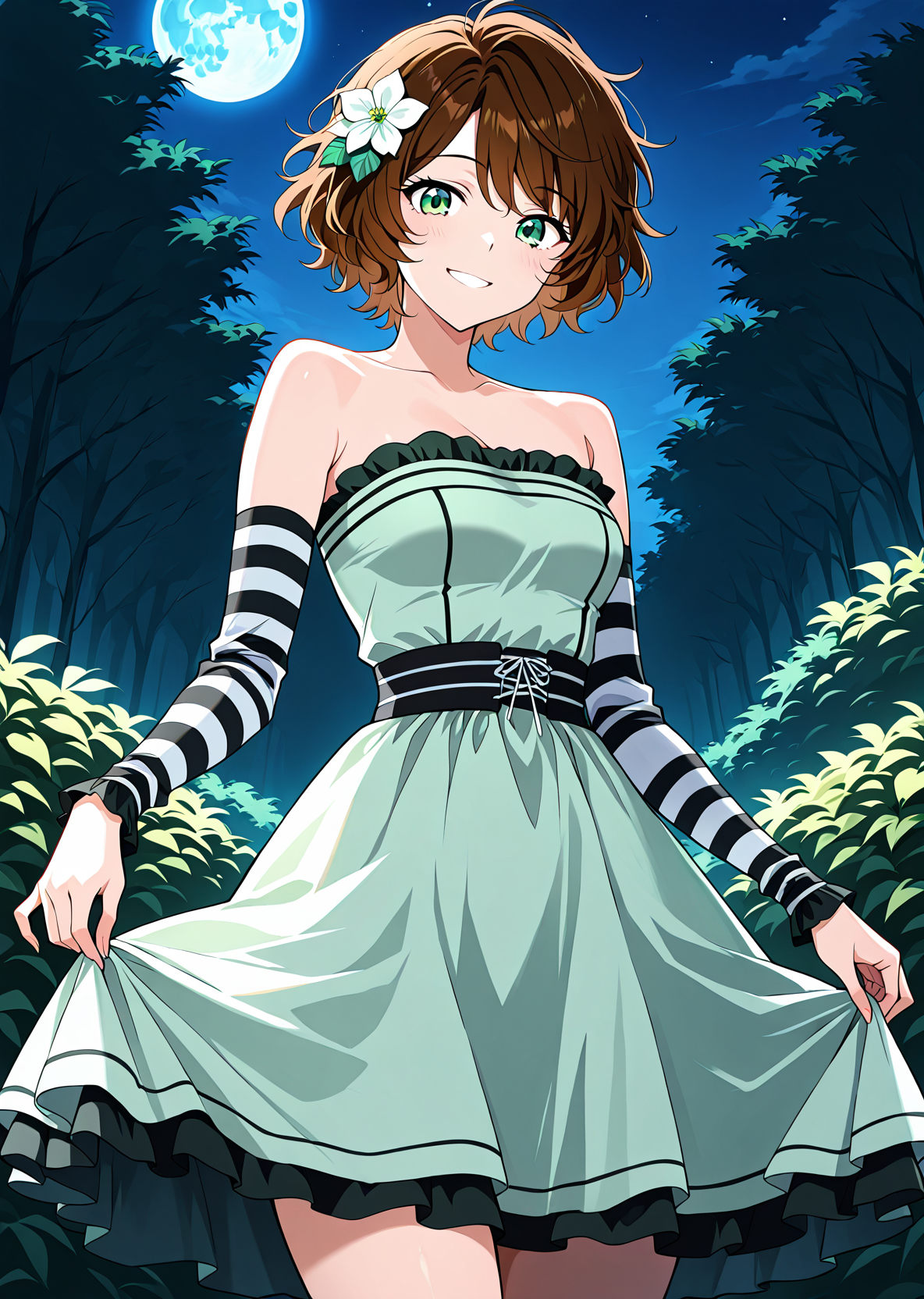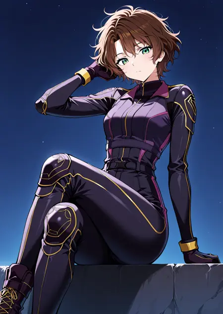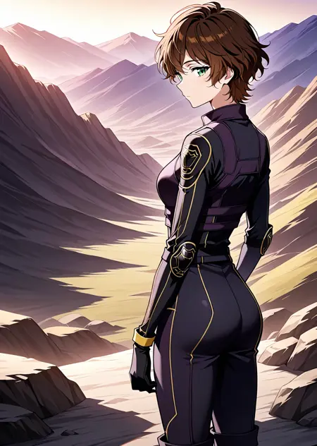 1 girl, solo, short hair, messy hair, wavy brown hair, green eyes, athletic body