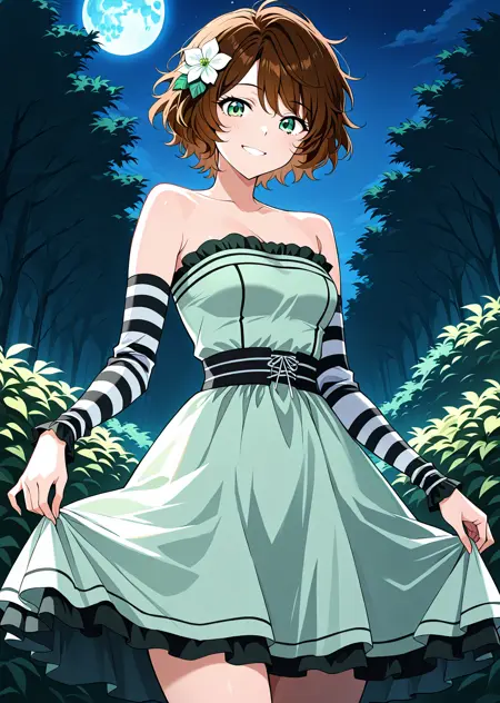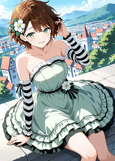 flower hair accessory, elegant mint green strapless dress with black and white layered accents, striped black and white detached sleeves