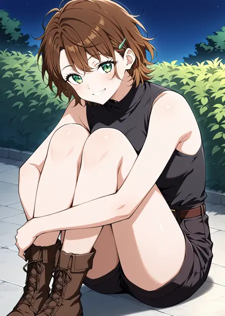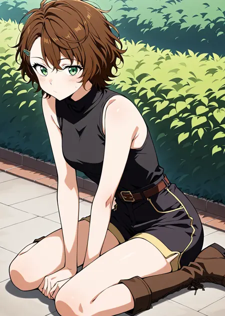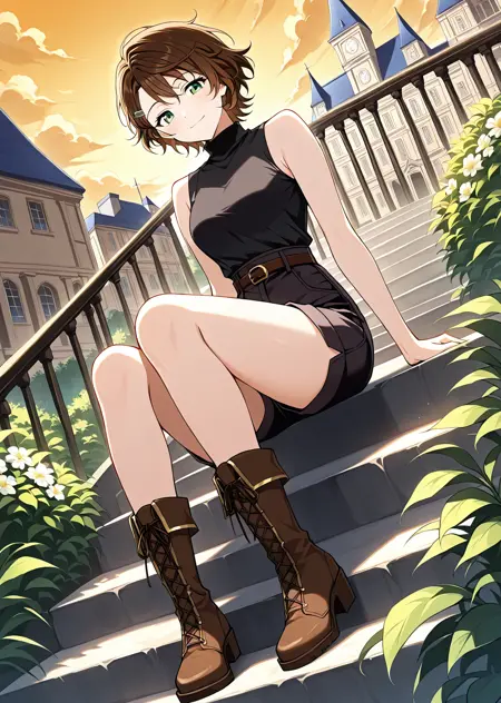 sleeveless black turtleneck top, high-waisted dark shorts with belt, side hair clip, thigh-high brown boots with gold trim, anime style