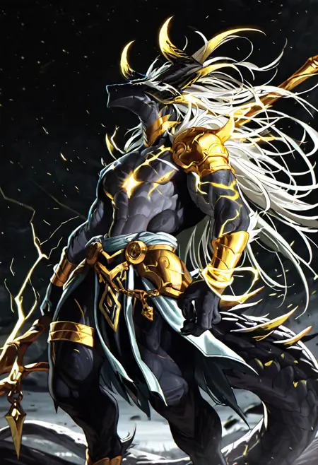 Prompt: ste1ch, dragon, horns, muscular, bracelet, white hair, dragon horns, dragon tail, armor, scar, colored skin,