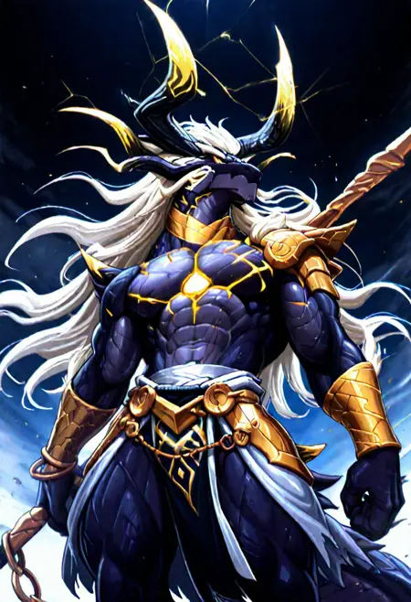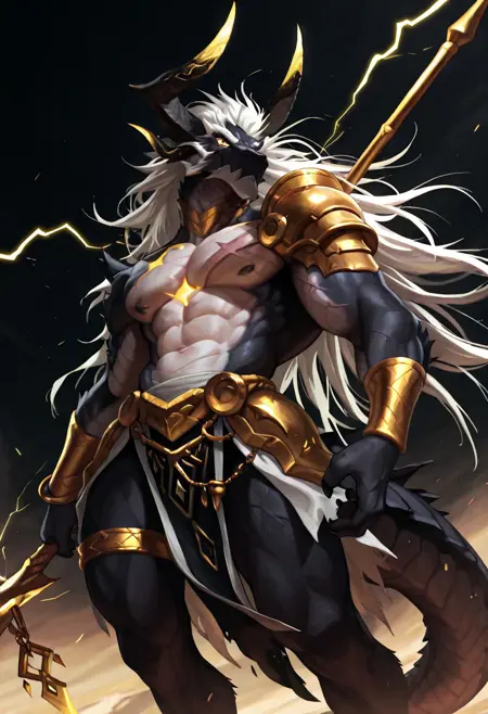 Prompt:steich, White long eyebrows, Small eyes, Eye Focus, Chest scar, Golden shoulder armor, Golden wristband, Thigh ring, tail, Holding a golden spear,