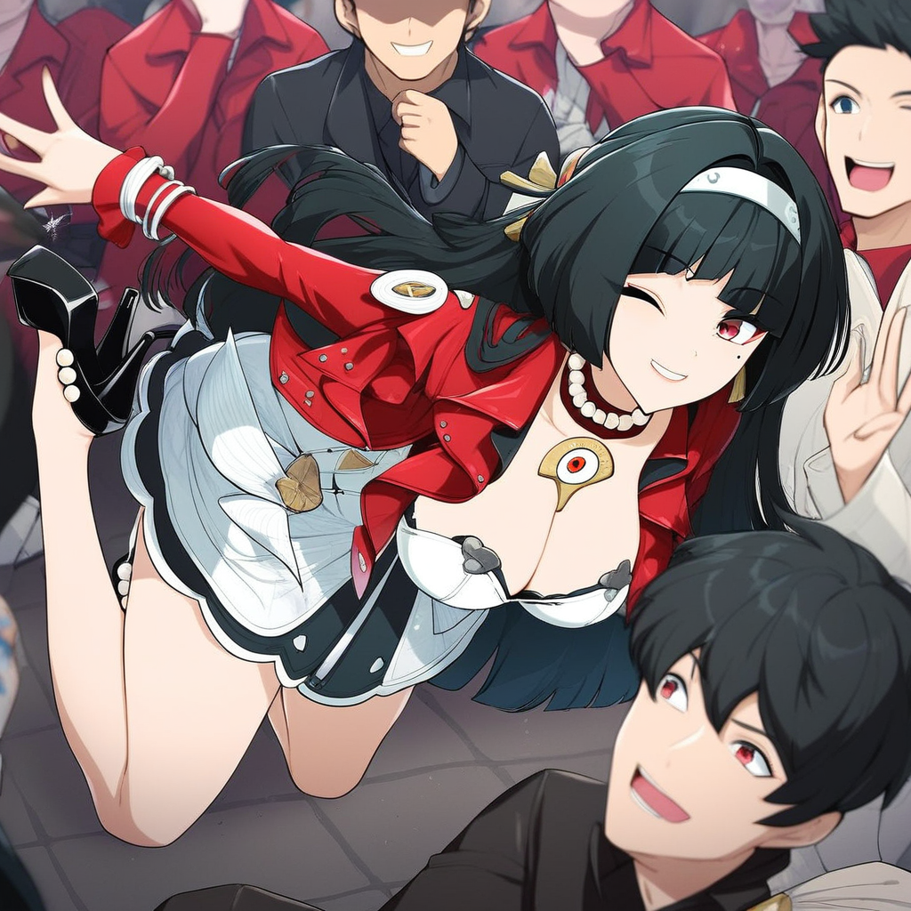 Outfit: red jacket, white corset, black panties, pearl necklace, pearl earrings, black high heels, pearl anklets, black bows on shoes,