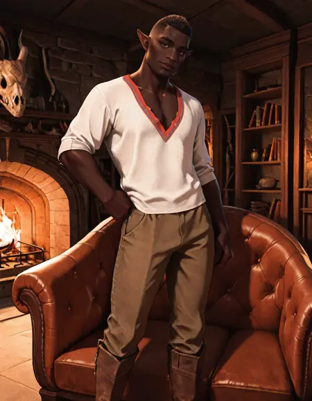 dav_davrin, 1boy, mature male, elf, pointy ears, very dark skin, curly hair, buzz cut, dark brown eyes, facial tattoo