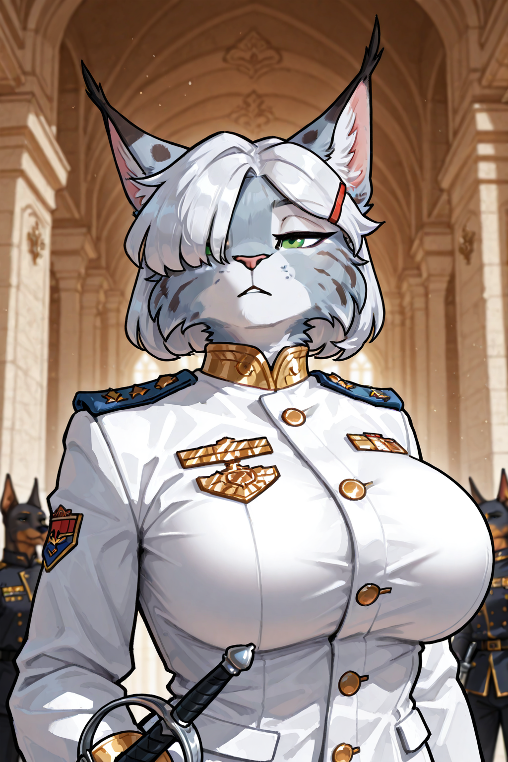 anthro, furry, female, lynx, green eyes, light blue fur, black spots, bob hair, hair over eye, one eye obstructed, red hairclip