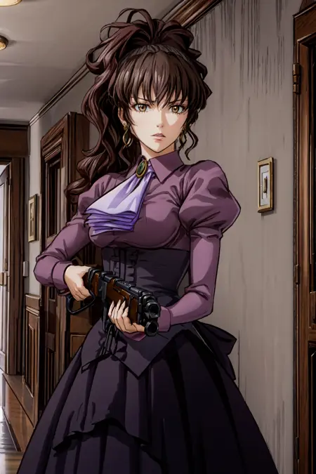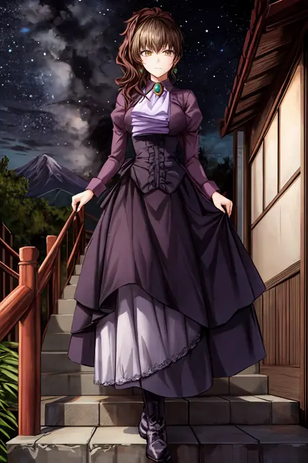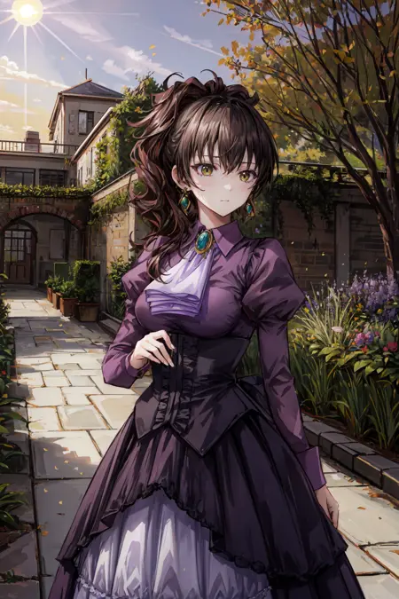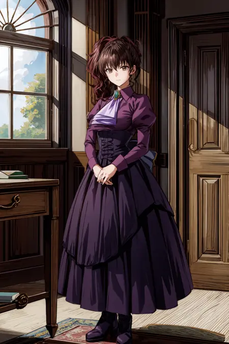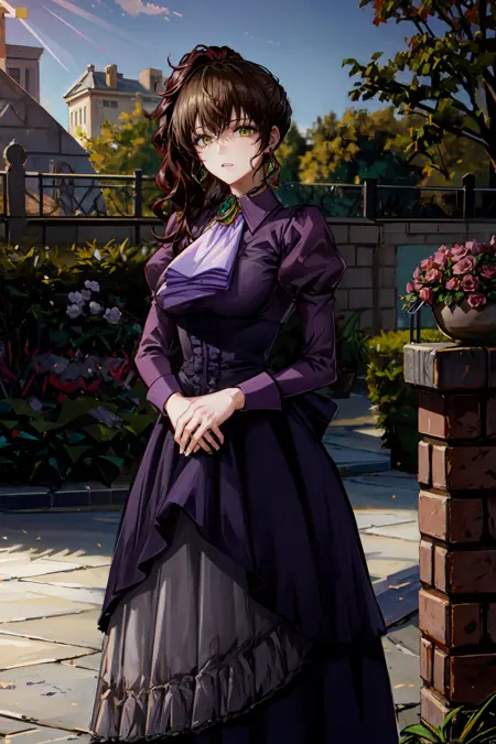 Casual outfit: violet dress, long dress, side ponytail, purple shirt, ascot, brooch, corset