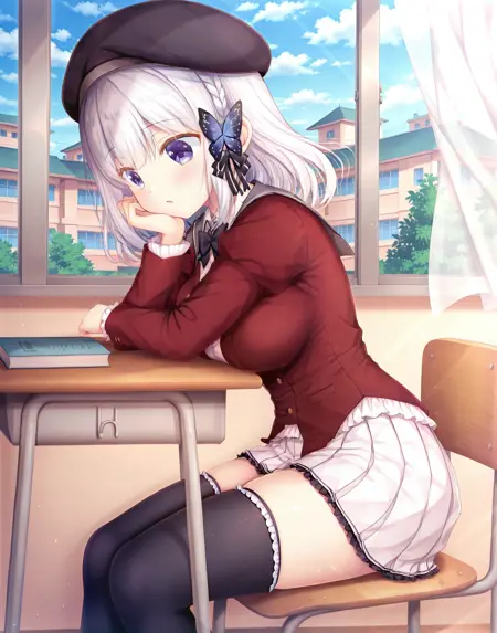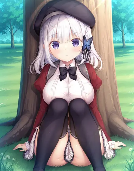 推荐提示:Hananoka Sumire,黑色头饰,双马尾,蝴蝶发饰,黑色领结,校服,白色百褶裙,黑色过膝袜,
