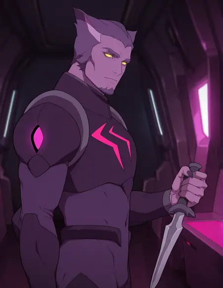 vld_thace, 1boy, very short hair, multicolored hair, purple body fur, yellow eyes, glowing eyes, solid eyes, no pupils, cat ears, goatee, long nails