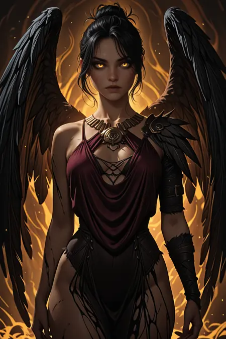 DAMorrigan, 1girl, black hair, yellow eyes, hair bun