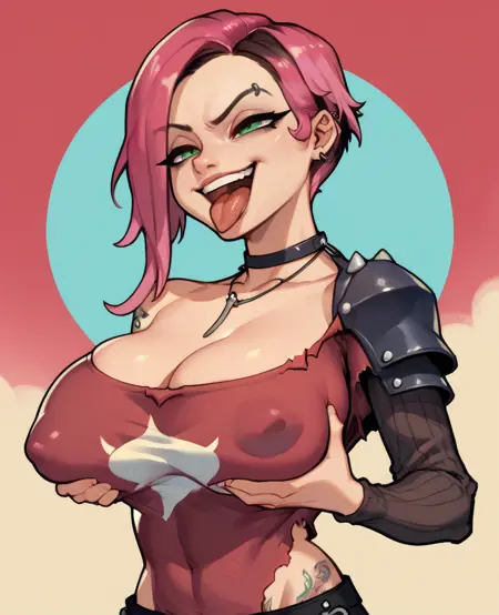 pink bra, red shirt, midriff, pants, belt, black detach sleeve, choker, jewerly, bracer, single shoulder pad, single arm warmer,