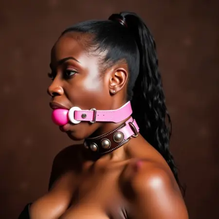 그는/그녀는 (빨강, 검정, 파랑, 분홍...) 색상의 볼 게그을 착용하고 있으며, 그 게그는 그의/그녀의 목에 둘러진 (빨강, 검정, 파랑, 분홍...) 스트랩으로 고정되어 있다.