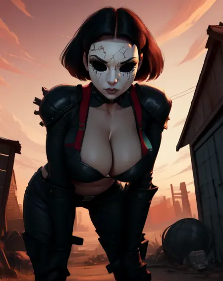 DollFace, doll mask, or mask, pink hair, twin tails, or black hair, - black eyes, may help