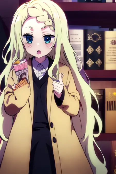 외모: 1소녀, 금발, 파란 눈, 긴 머리, 뺨붉음, 땋은 머리, 곱슬머리, 머리 장식