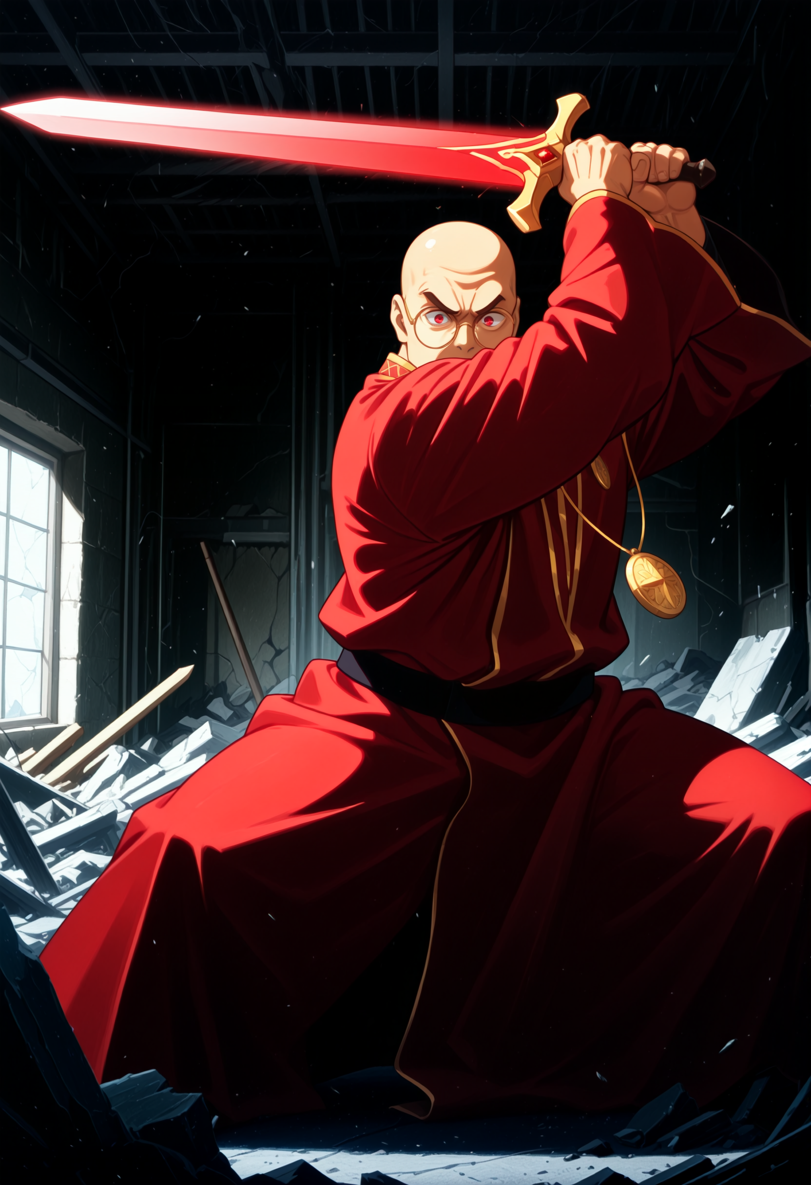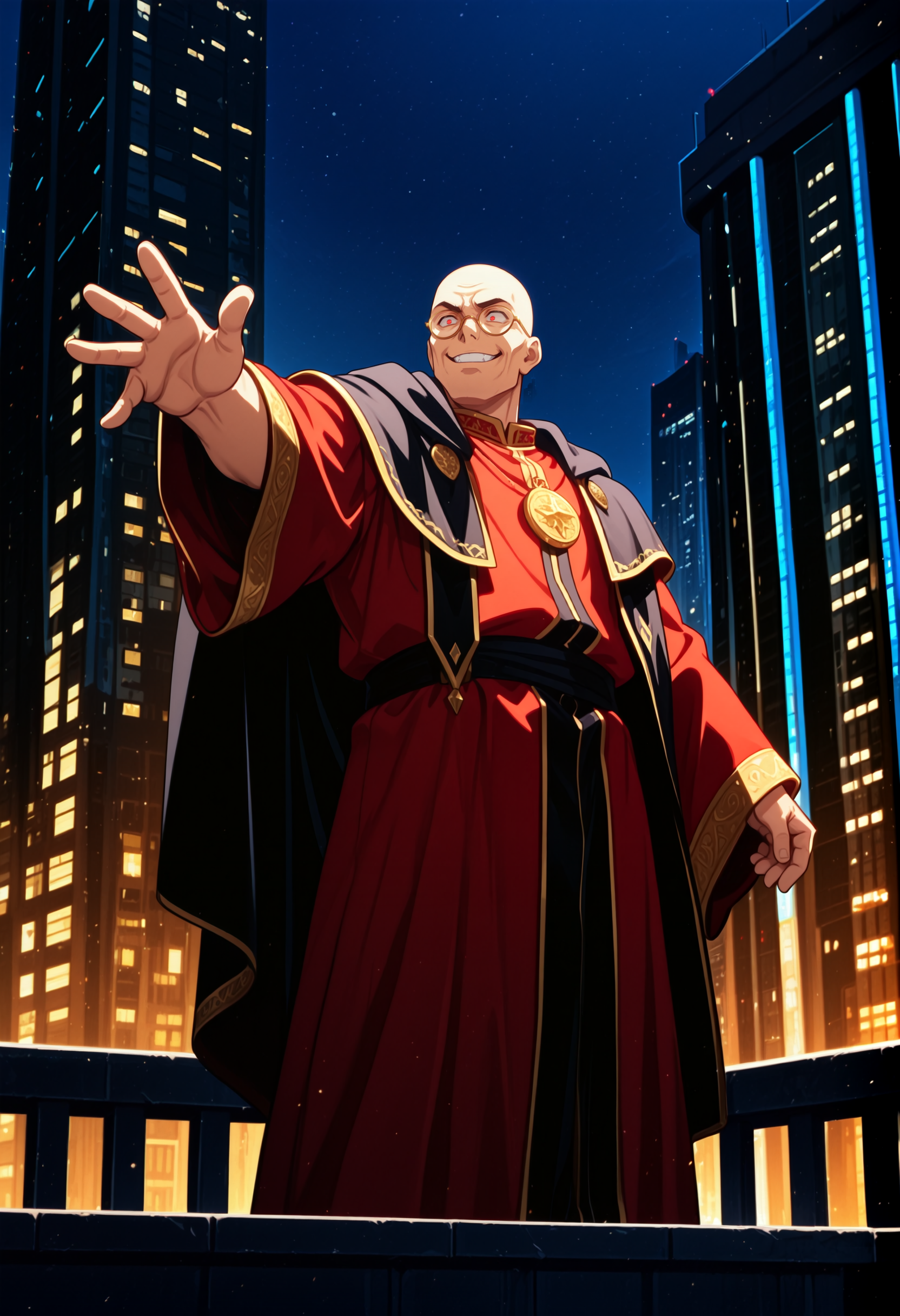 mature male, glasses, male focus, bald, red eyes