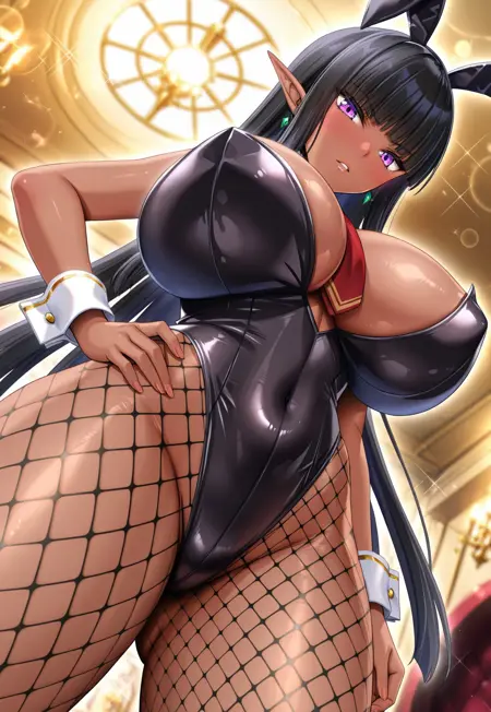 タグ: raelda le failda, ダークエルフ, 黒肌の女性, 黒髪, 長髪, ヒメカット, 紫色の瞳, 尖った耳, 緑のイヤリング, ジュエリー, 巨乳, 曲線美