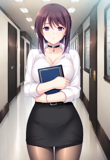 default_outfit, collared shirt, white shirt, pendant choker, pencil skirt, black skirt, belt, pantyhose