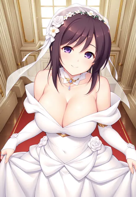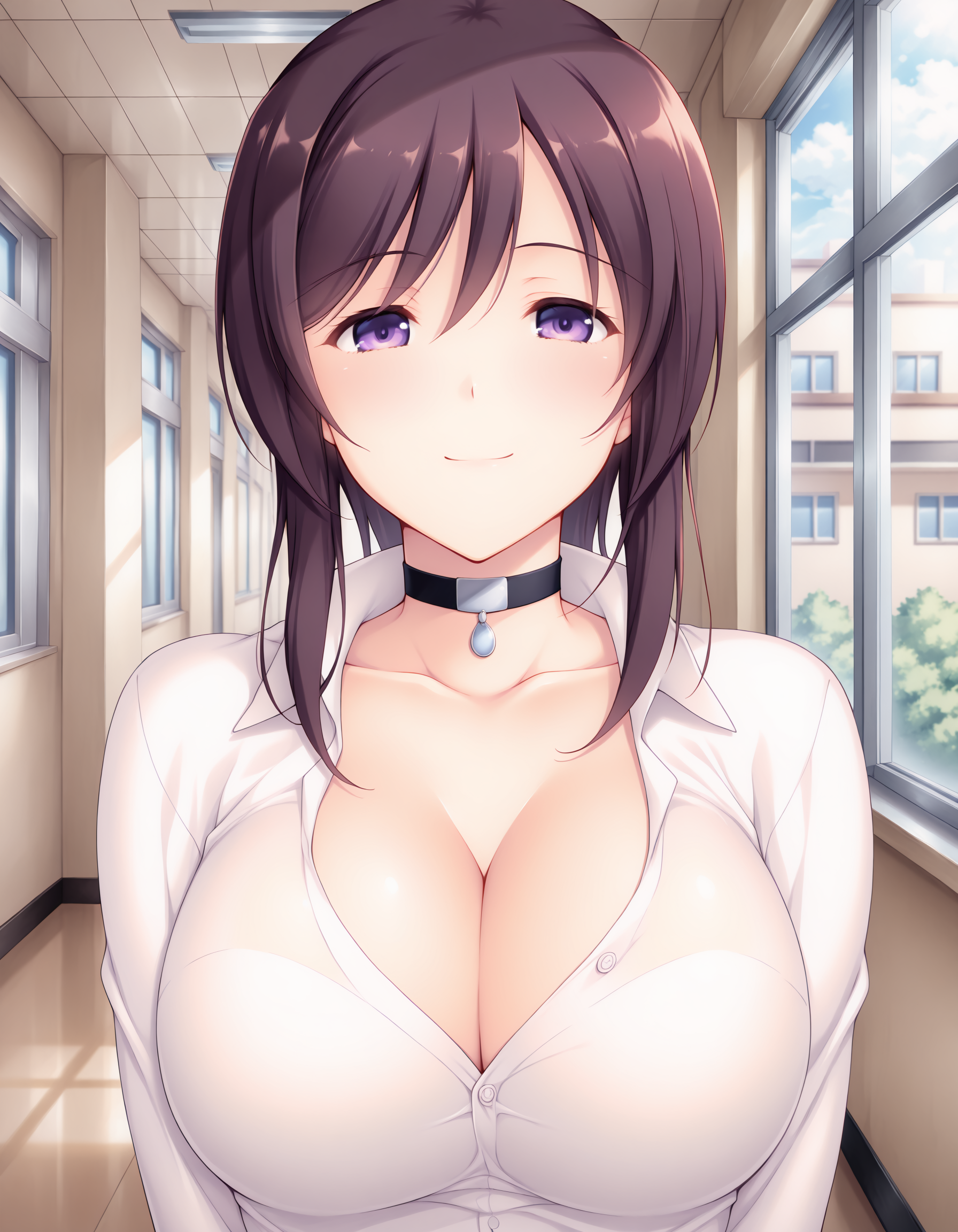 shizumisuzune, 1girl, medium hair, brown hair, purple eyes, large breasts