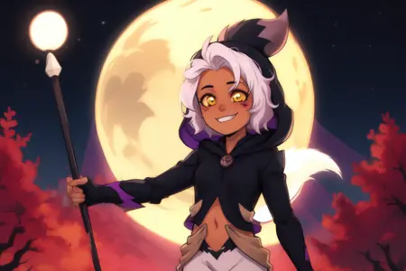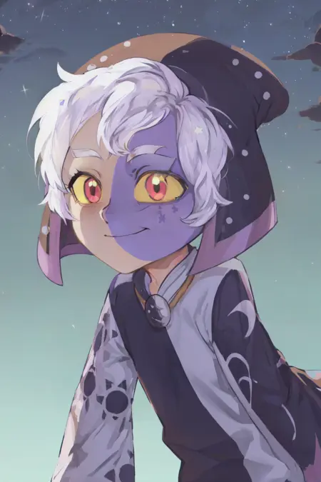 lora:TheCollector-10:1, TheCollectorTOH, 1boy, closed mouth, colored sclera, forest, hood, nature, red eyes, short hair, solo, white hair, yellow sclera, smile