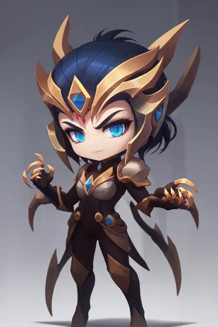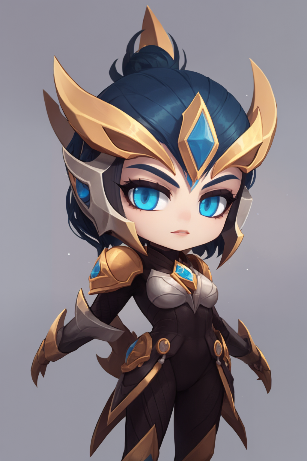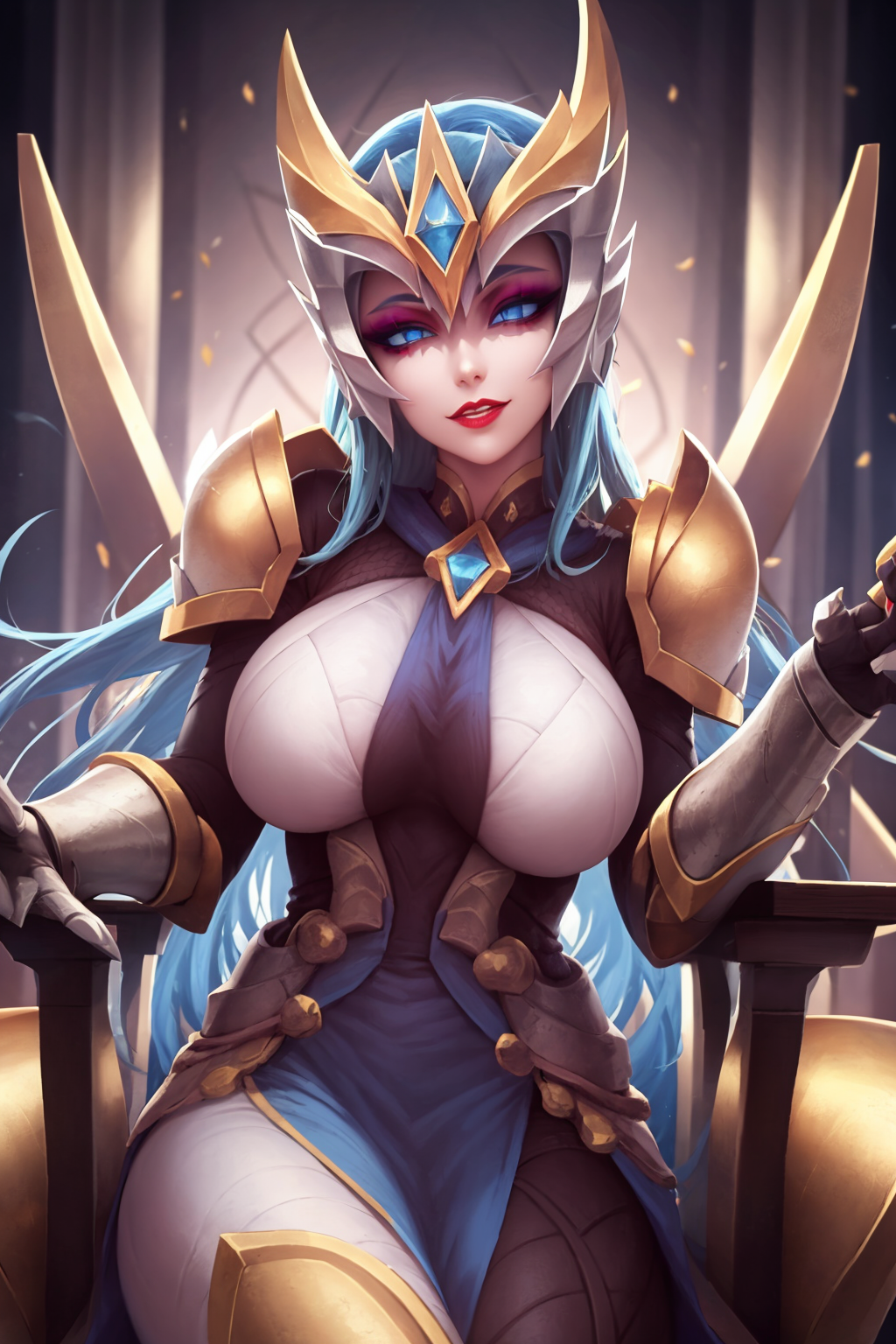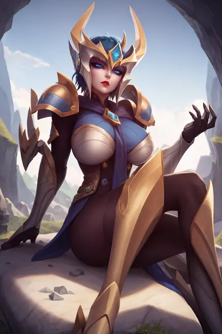 Other prompts : blue eyes, glowing eyes, blue hair, short hair, helmet, armor, gold amor, shoulder armor, makeup, red lipstick