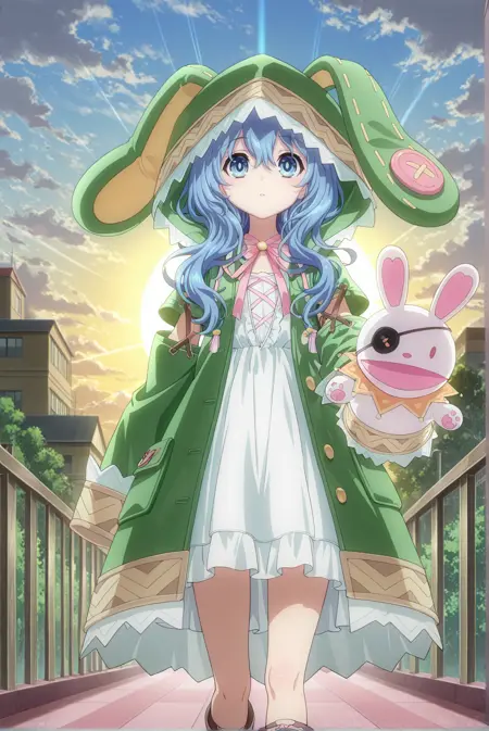 星空:yoshi-date,yo-asd,1girl,蓝发,长发,单人,蓝眼,外套,白裙,兜帽,兜帽拉起,动物帽兜,兔子帽兜,绿色外套,分体袖子,粉红丝带,靴子,手偶,毛绒兔子玩偶,眼罩式玩偶