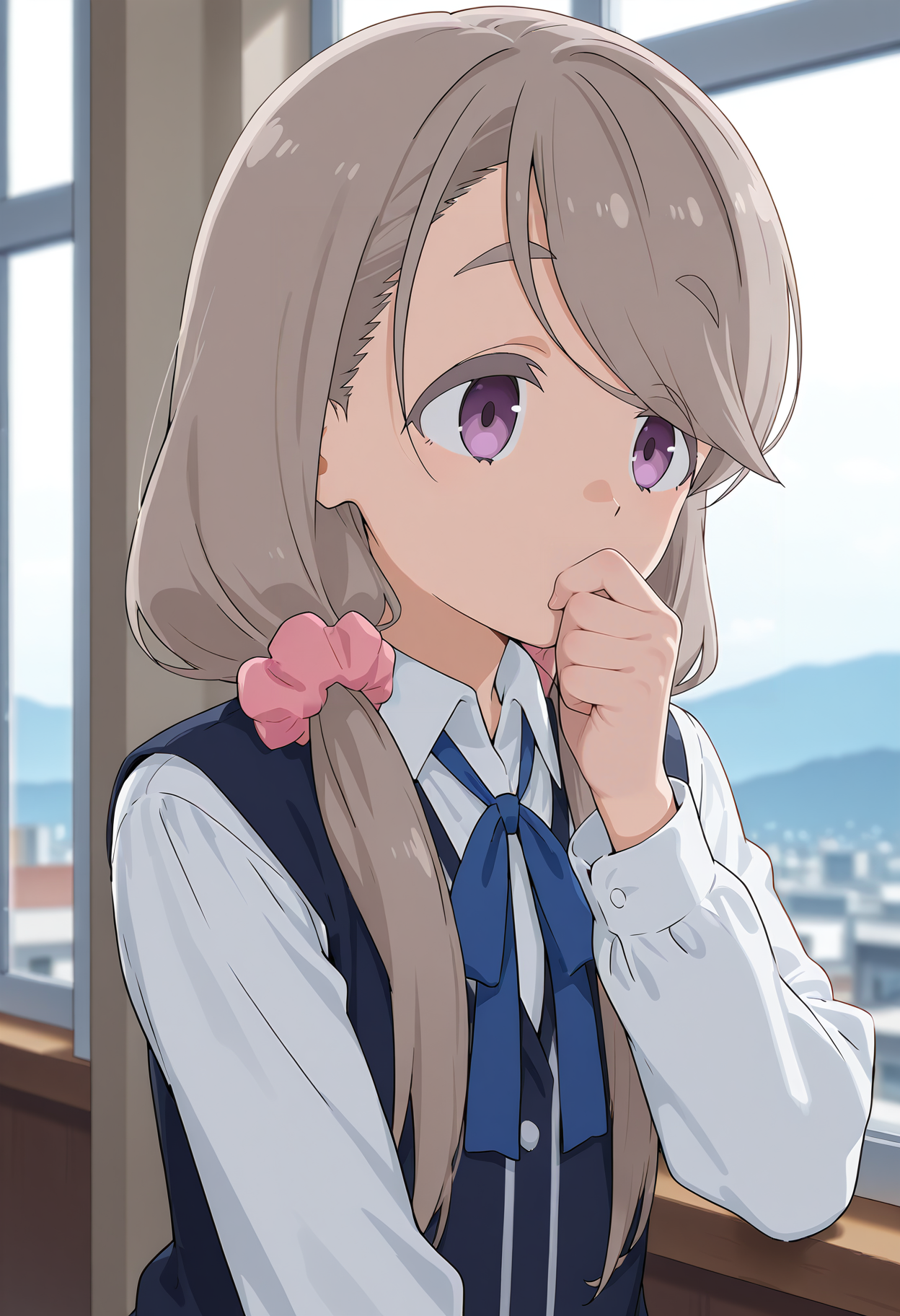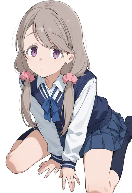 blue sweater vest,pink scrunchie,blue skirt,socks,white shirt,kneehighs,