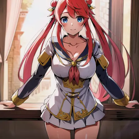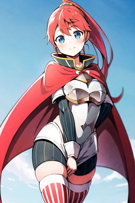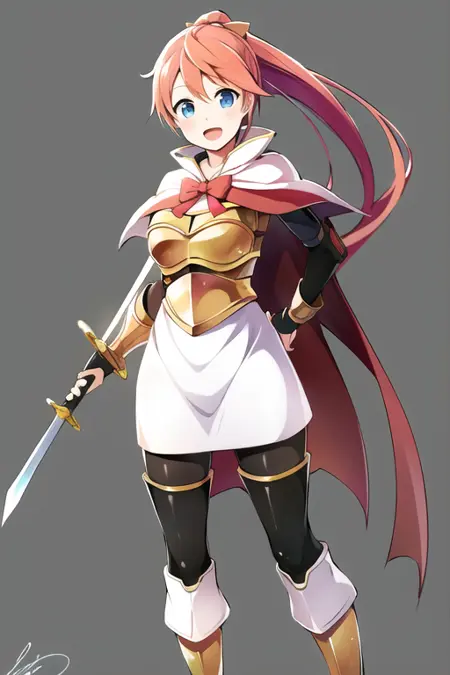 她的骑士造型可能不需要这么多标签,但这些是自动标签器生成的标签:1girl, solo, weapon, sword, white background, cape, ponytail, open mouth, pantyhose, dated, holding weapon, simple background, armor, holding sword, boots, holding, breastplate, bracelet, signature, thigh boots, thighhighs, looking at viewer, jewelry, thighhighs over pantyhose, bow。