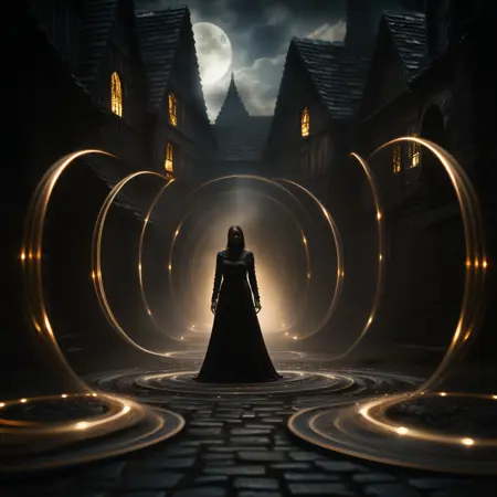 1boy, 1girl, 1other, arms at sides, bald, bare shoulders, black hair, blonde hair, body glow effect, breasts, brown hair, cape, cloak, closed eyes, closed mouth, depth of field, dress, facial hair, from behind, glowing, golden effect, golden spikes, ground minis, ground ripples, hood, jewelry, long hair, looking at viewer, ponytail, realistic, reflection, ripples, robe, short hair, sky daggers, sky hoops, solo, standing, time elemental, upper body, white hair, white rising effect,
