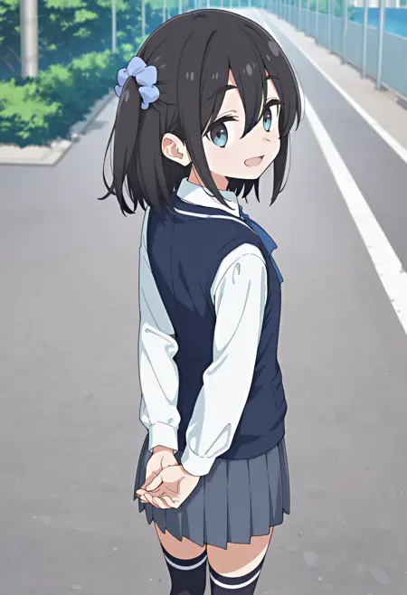 amamiyasatsuki-default,blue eyes,black hair,one side up, hair scrunchie,school uniform,blue ribbon,white shirt,long sleeves,blue vest, pleated skirt,black thighhighs, sneakers